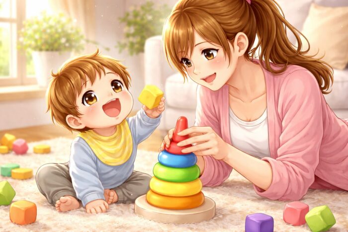 2026.03.21ikuji-mama-baby-omocha-asobu-egao.webp ポスト シェア はてブ 送る Pocket知育おもちゃで遊ぶ赤ちゃんと優しく見守るママの楽しい時間のイメージ