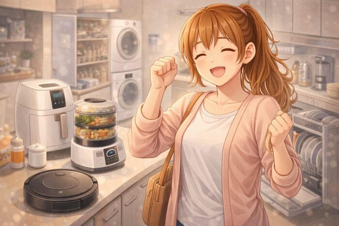 家電や便利グッズを使ってワンオペ家事が楽になり笑顔で安心しているママのイラスト