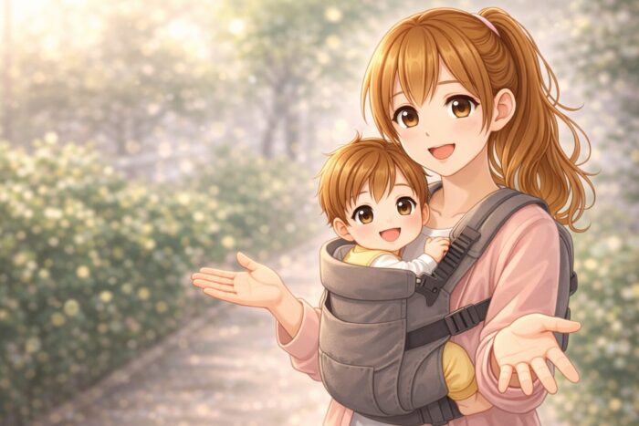 抱っこ紐で赤ちゃんを優しく抱っこして安心した表情の母親の育児シーン