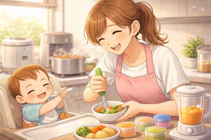 離乳食を笑顔で食べる赤ちゃんと嬉しそうに見守るママの温かいイラスト